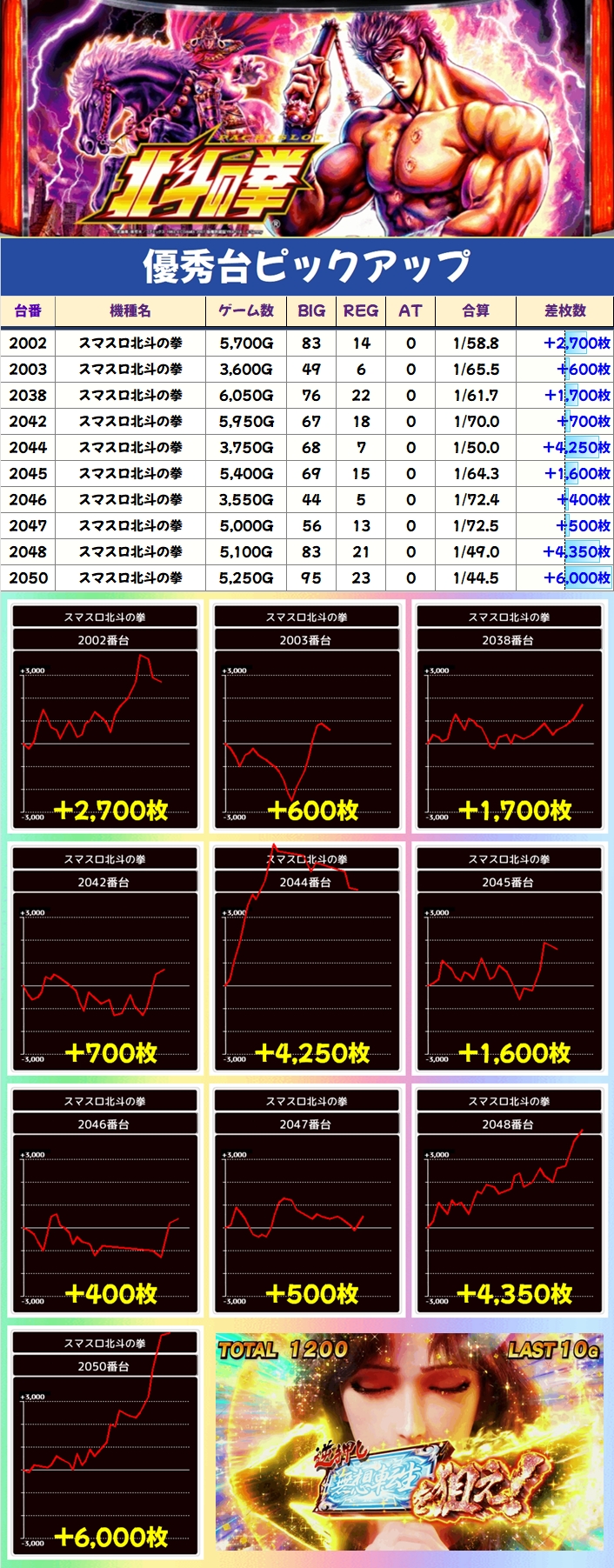 なお、スマスロ北斗はポスター仕掛けでデータランプのキャラごとにお宝台が毎日投入されており、今回は複数のキャラに当たりが散りばめられていたようです。
