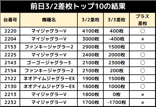 【前日差枚TOP10が当日も好調?】