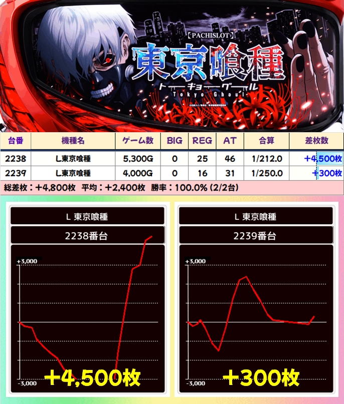 【2台並び】L東京喰種(2238台番〜2239台番)→平均+2,400枚(2/2台+)