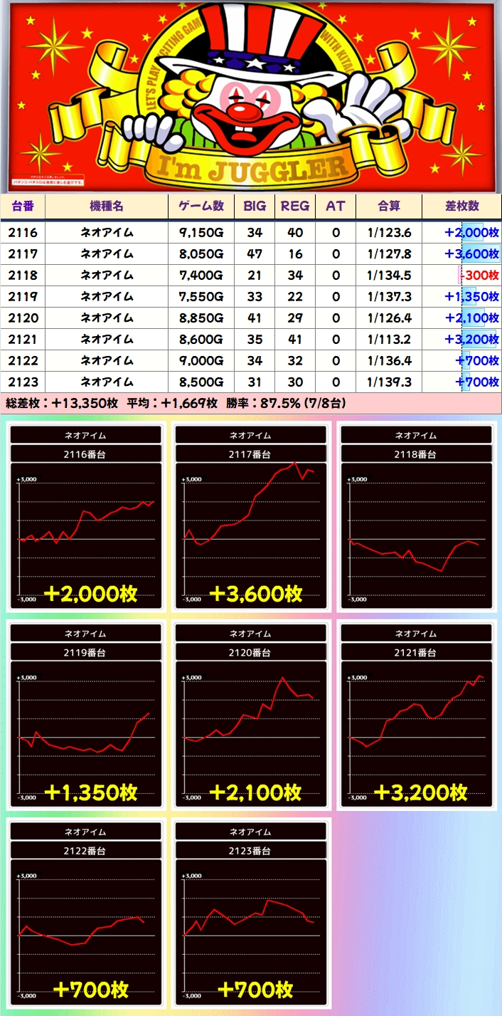 【8台並び】ネオアイム(2116台番〜2123台番)→平均+1,669枚(7/8台+)