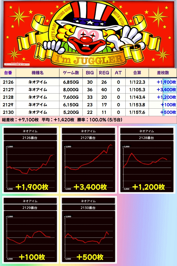 【5台並び】ネオアイム(2126台番〜2130台番)→平均+1,420枚(5/5台+)