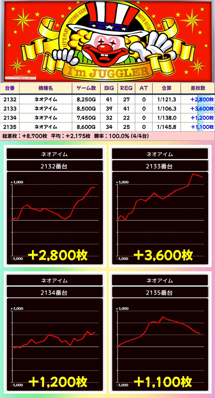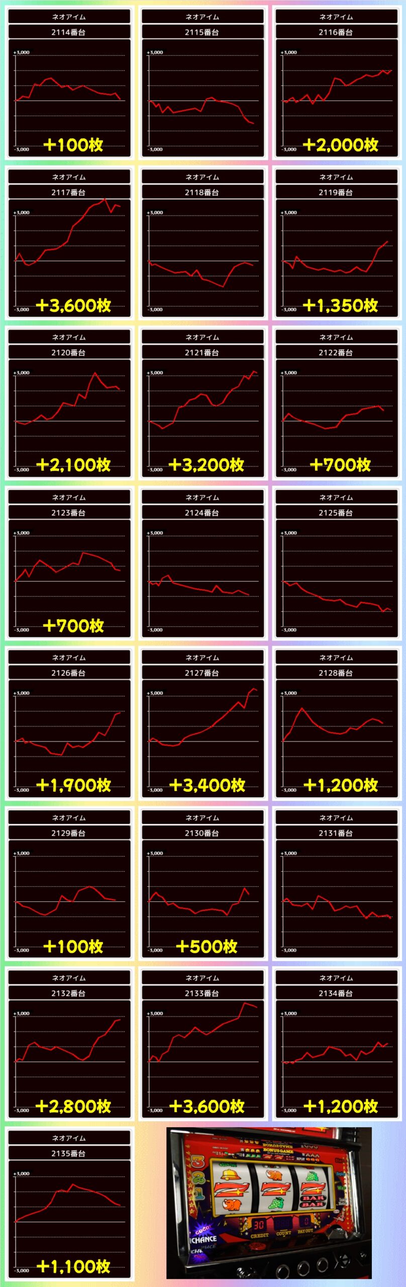 【4台並び】ネオアイム(2132台番〜2135台番)→平均+2,175枚(4/4台+)