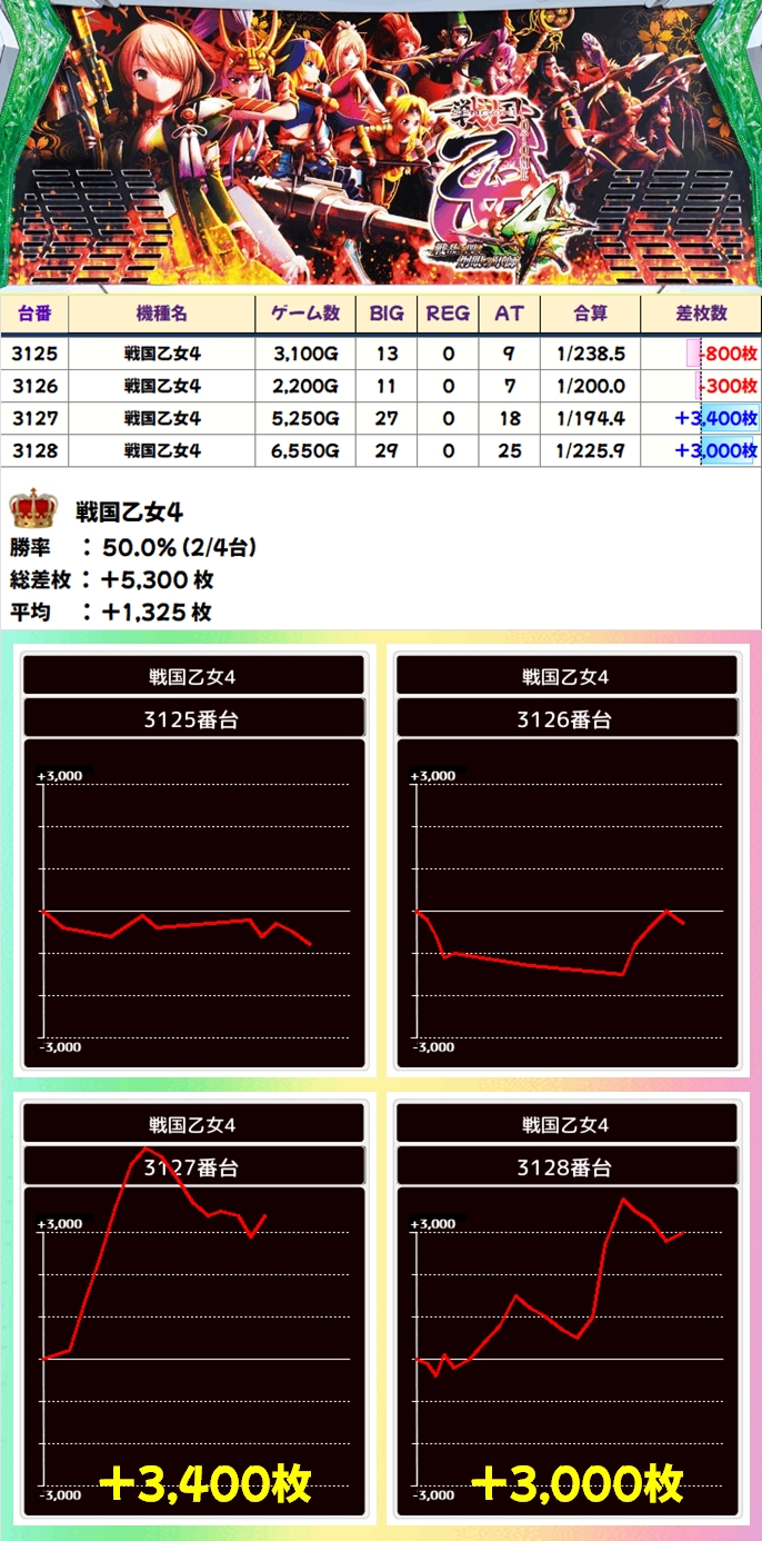 【1/2系濃厚】戦国乙女4(2/4台+)→平均+1,325枚