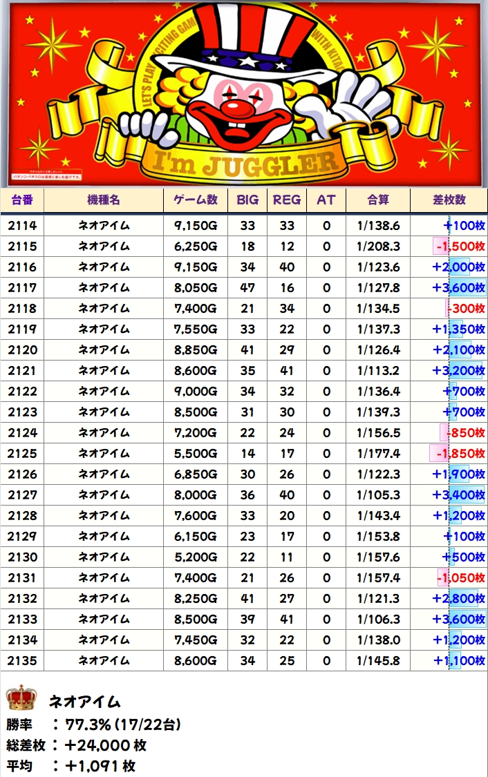 【1/2系濃厚】ネオアイム(17/22台+)→平均+1,091枚