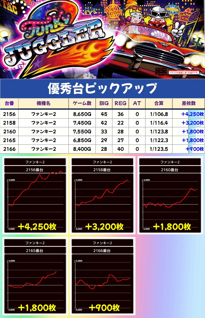 今回はベスト5の結果が優秀で、5台中5台が全てプラス差枚と「据え置き」濃厚の結果に!