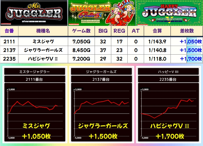 この日はジャグラー全体が盛り上がっており、ほとんどの機種が高配分という結果に!