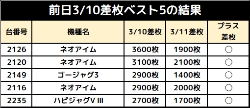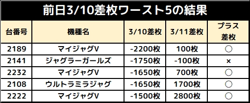イラストから連想できる仕掛けはこのようになっており、この日は前日(3/10)の差枚ベスト5とワースト5がいずれも好結果になっていました。
