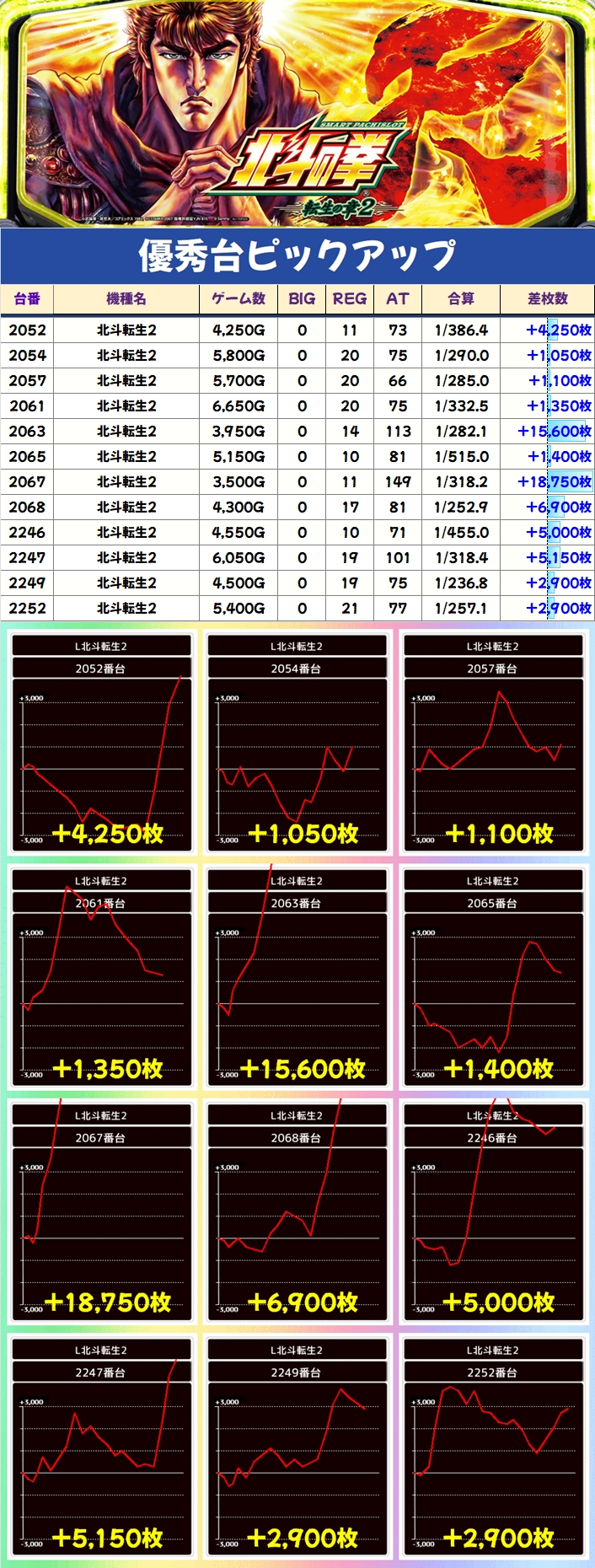 現在のメイン機種となっている北斗シリーズですが、この日はどちらも高配分になっており、ななこポストにヒントを確認できた北斗転生2は1/2系と思しき結果に!