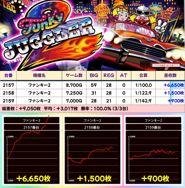 【3台並び】ファンキー2(2157台番〜2159台番)→平均+3,017枚(3/3台+)
