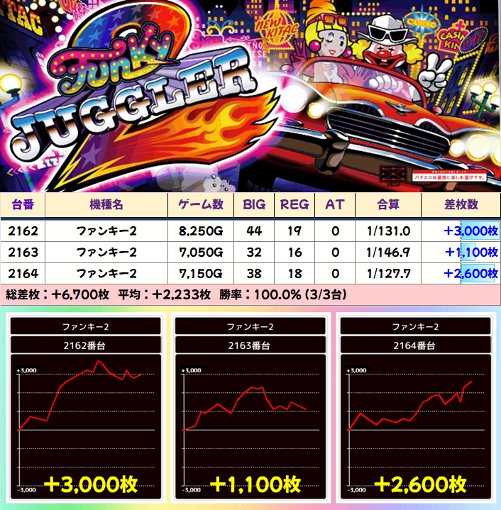 【3台並び】ファンキー2(2162台番〜2164台番)→平均+2,233枚(3/3台+)