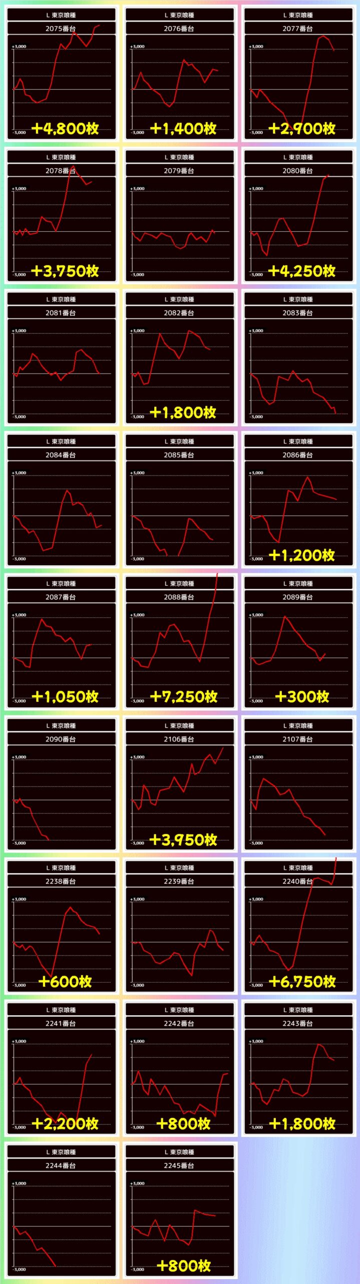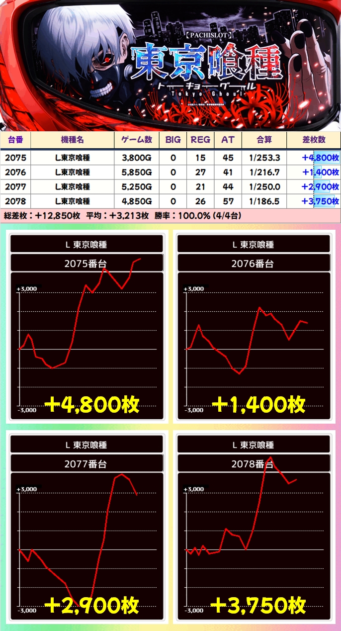 【4台並び】東京喰種(2075台番〜2078台番)→平均+3,213枚(4/4台+)