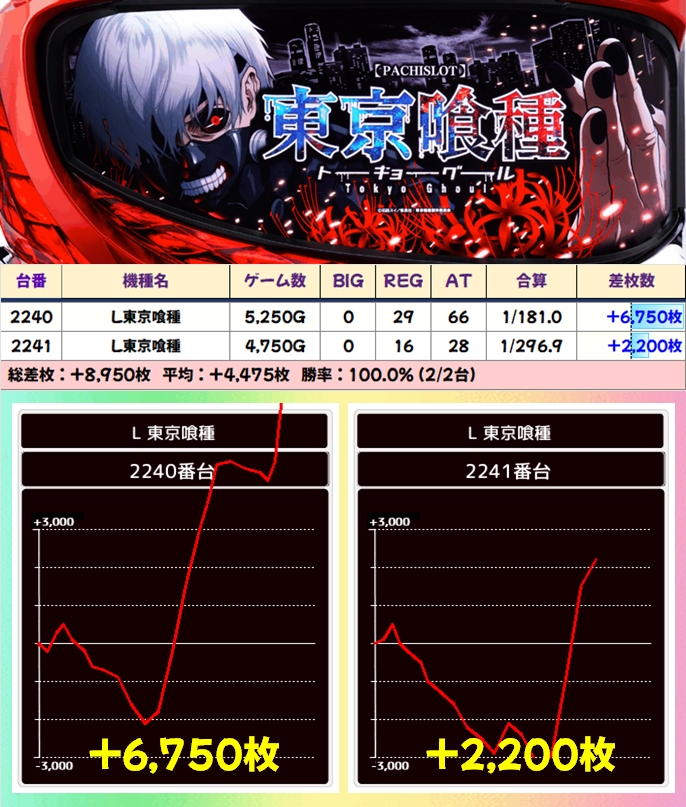 【2台並び】東京喰種(2240台番〜2241台番)→平均+4,475枚(2/2台+)