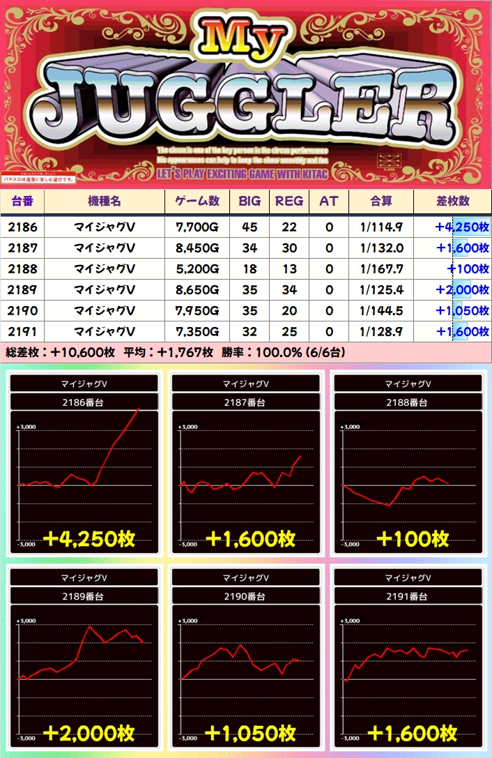 【6台並び】マイジャグV(2186台番〜2191台番)→平均+1,767枚(6/6台+)