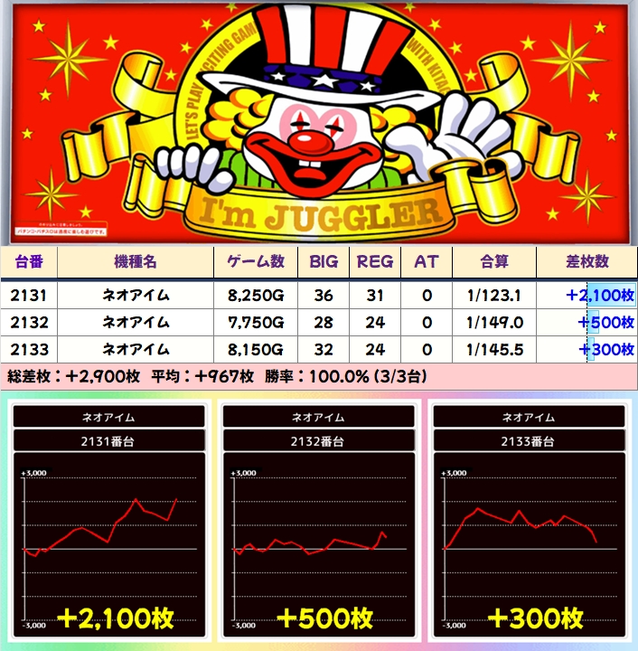 【3台並び】ネオアイム(2131台番〜2133台番)→平均+967枚(3/3台+)