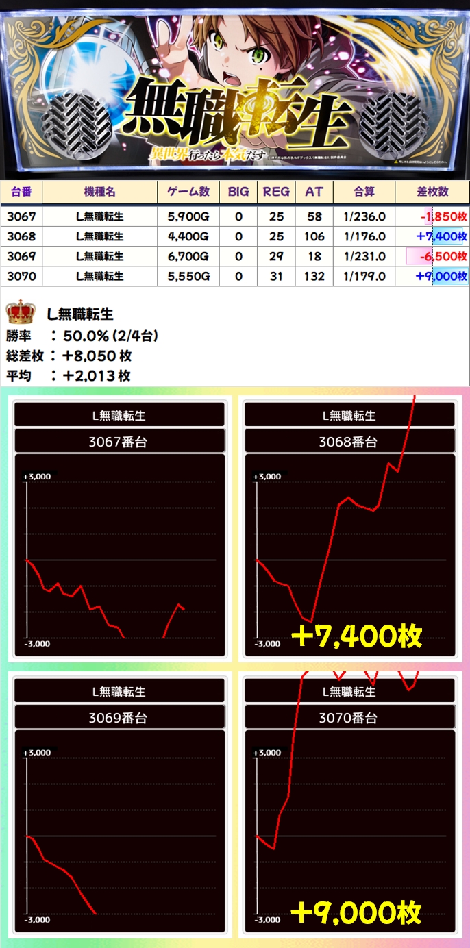 また、オススメ機種以外にも仕掛けを確認でき、3Fに設置されている戦国乙女4と無職転生が1/2系濃厚の結果になっていました。こちらの2機種は悪番対策で仕掛けの対象になった可能性が高そうですね。