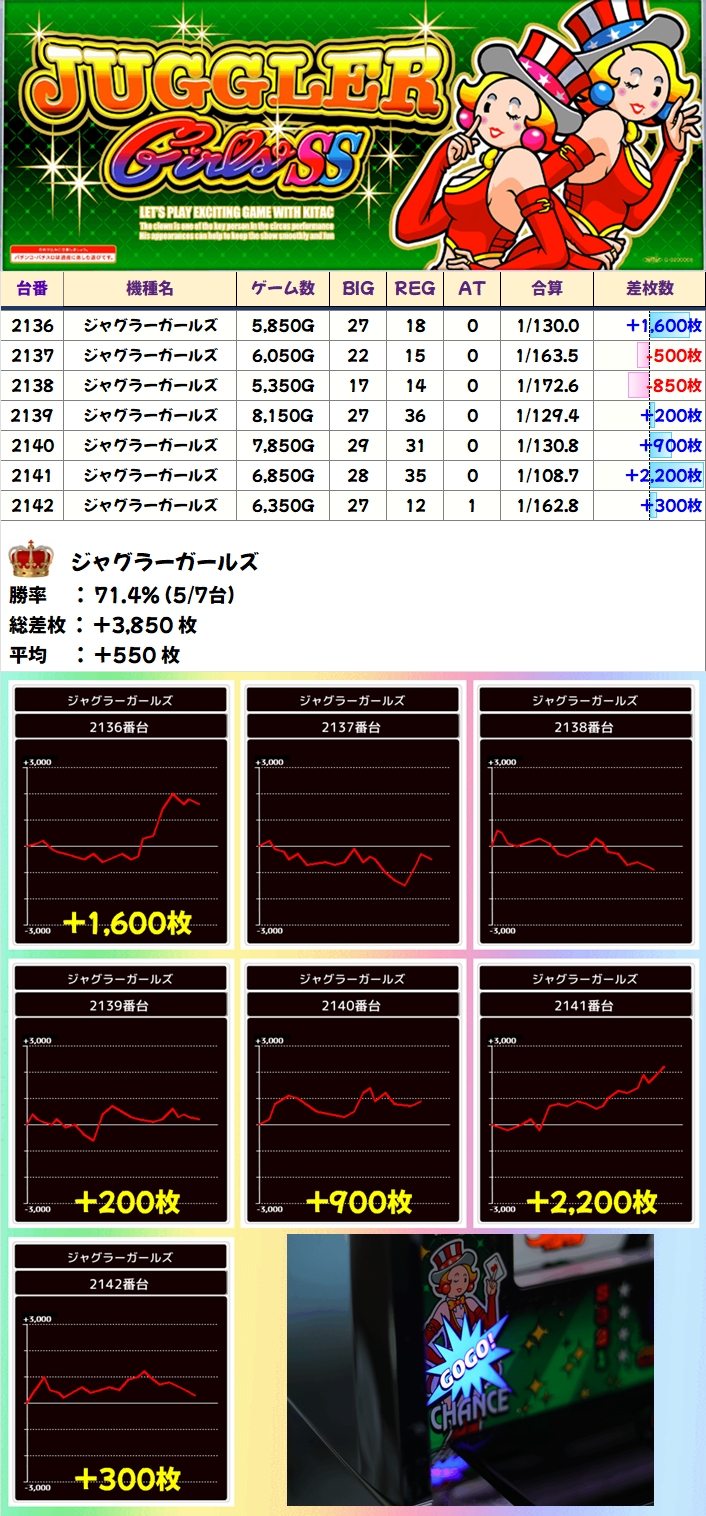 【3台並び】ジャグラーガールズ(2140台番〜2142台番)→平均+1,133枚(3/3台+)