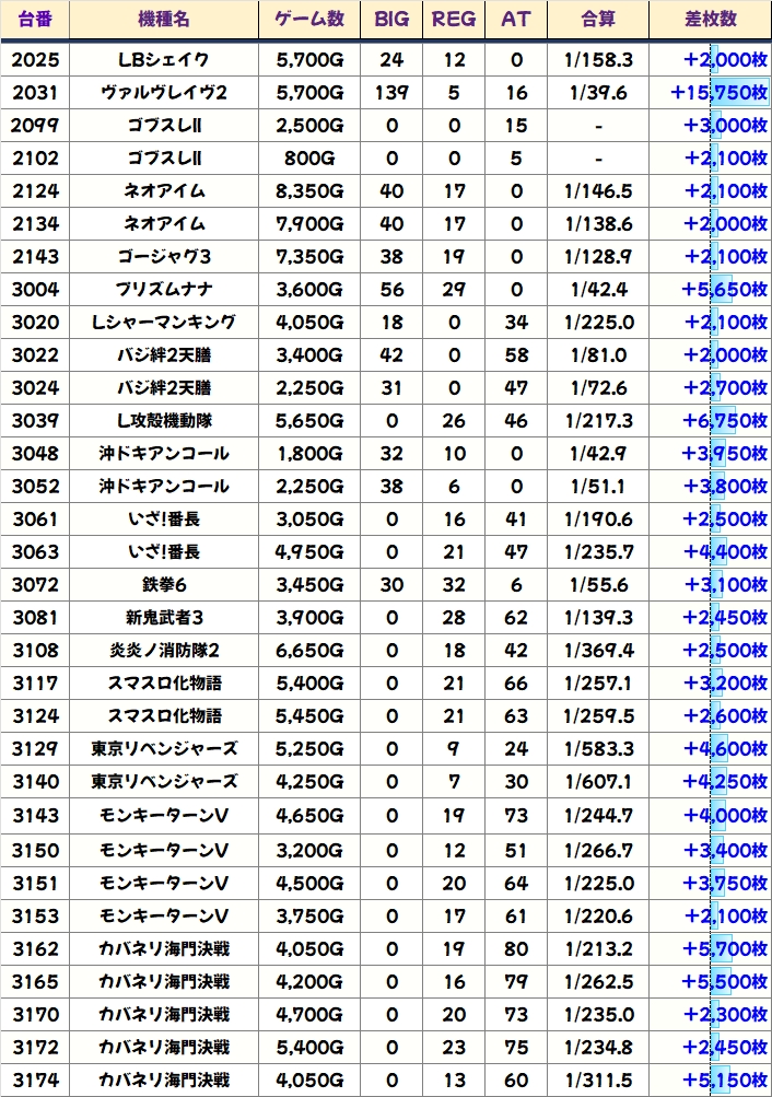 その他の単品からも大量出玉を確認でき、ヴァルヴレイヴ2から+15750枚の万枚オーバー台が出現していました!