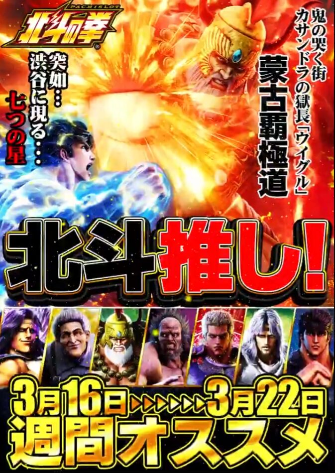 北斗シリーズはどちらも週間オススメとなっており、スマスロ北斗のほうはポスターのキャラに絡めた仕掛けが毎日用意されています。
