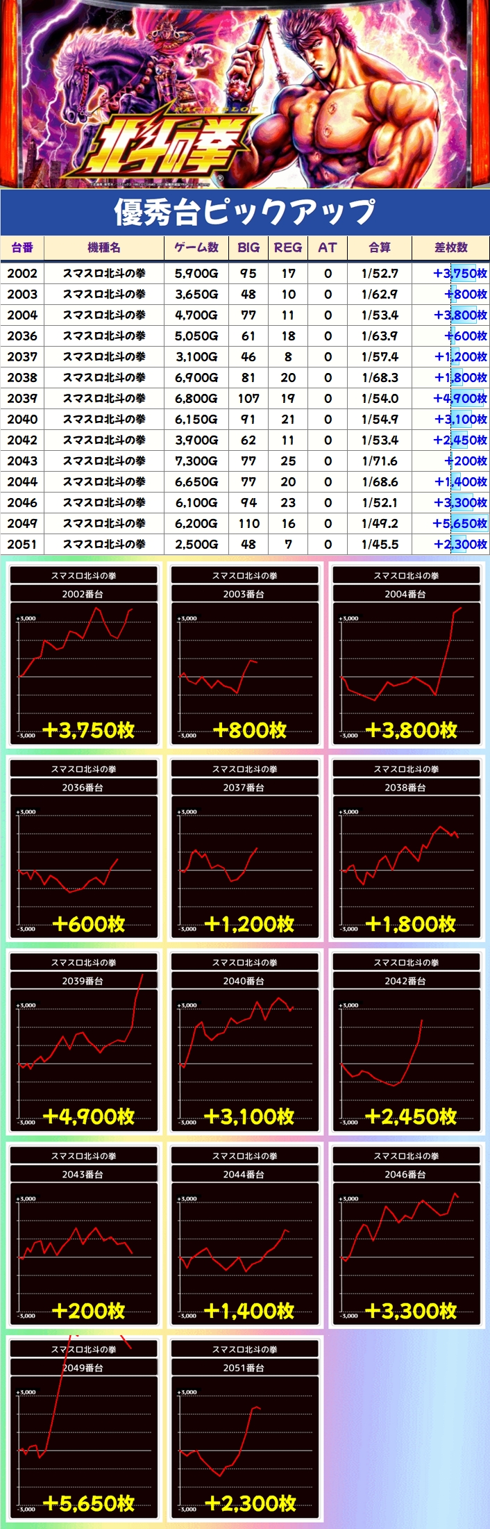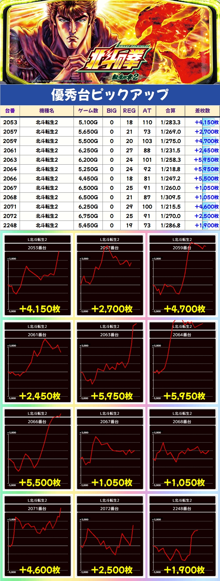 現在のメイン機種となっている北斗シリーズですが、この日はどちらからも優秀台を多数確認でき、スマスロ北斗のほうは1/2系と思しき結果になっていました。