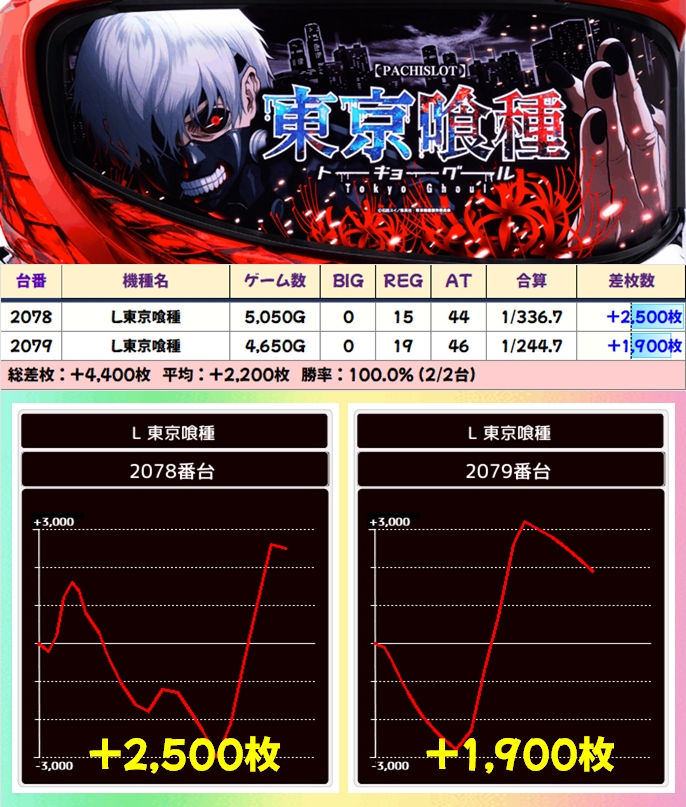 【2台並び】東京喰種(2078番台〜2079番台)→平均+2,200枚(2/2台+)