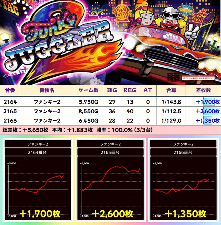 【3台並び】ファンキージャグラー2(2164番台〜2166番台)→平均+1,883枚(3/3台+)