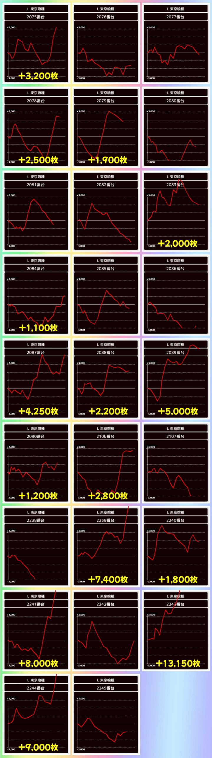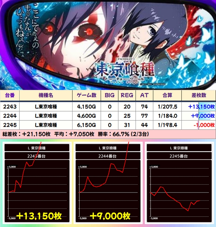 【3台並び】東京喰種・董香パネル(2243番台〜2245番台)→平均+7,050枚(2/3台+)