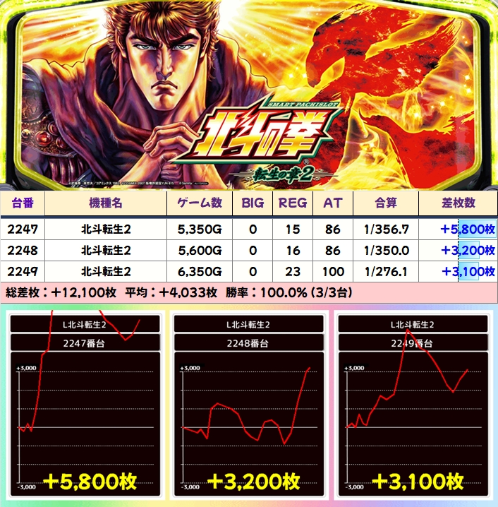 【3台並び】北斗転生2(2247番台〜2249番台)→平均+4,033枚(3/3台+)