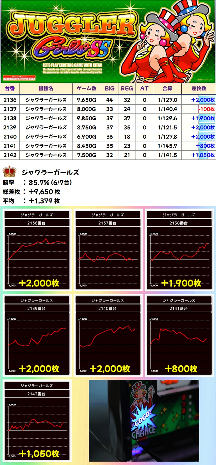 【1/2系濃厚】ジャグラーガールズ(6/7台+)→平均+1,379枚