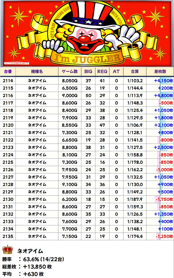 【1/2系濃厚】ネオアイム(14/22台+)→平均+630枚
