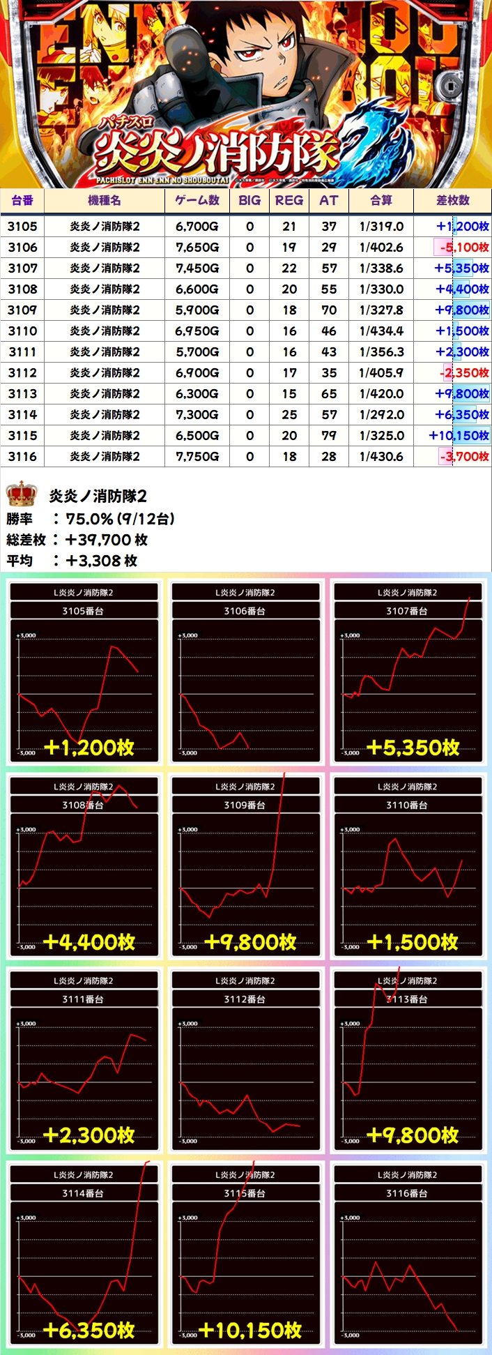 炎炎ノ消防隊2からは万枚クラスの台が複数出現しており、機種全体でも平均+3300枚超と圧倒的な出玉を記録していました。