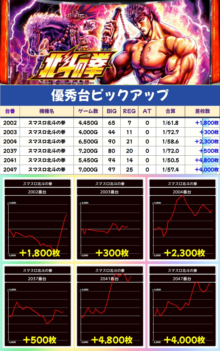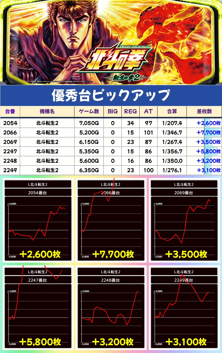 現在のメイン機種となっている北斗シリーズですが、この日は両機種から優秀台を複数確認でき、北斗転生2からは+5000枚over台が複数出現。