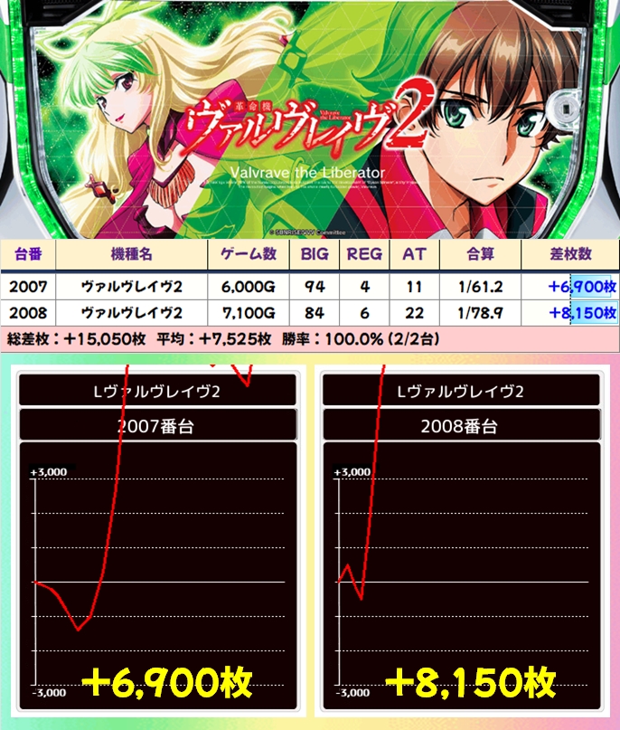 【2台並び】Lヴァルヴレイヴ2(2007番台〜2008番台)→平均+7,525枚(2/2台+)