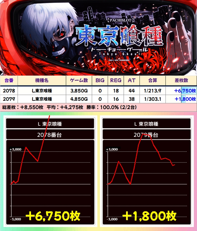 【2台並び】L東京喰種(2078番台〜2079番台)→平均+4,275枚(2/2台+)