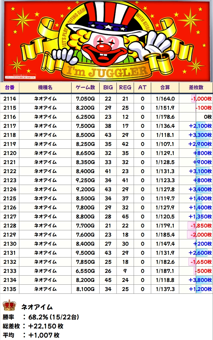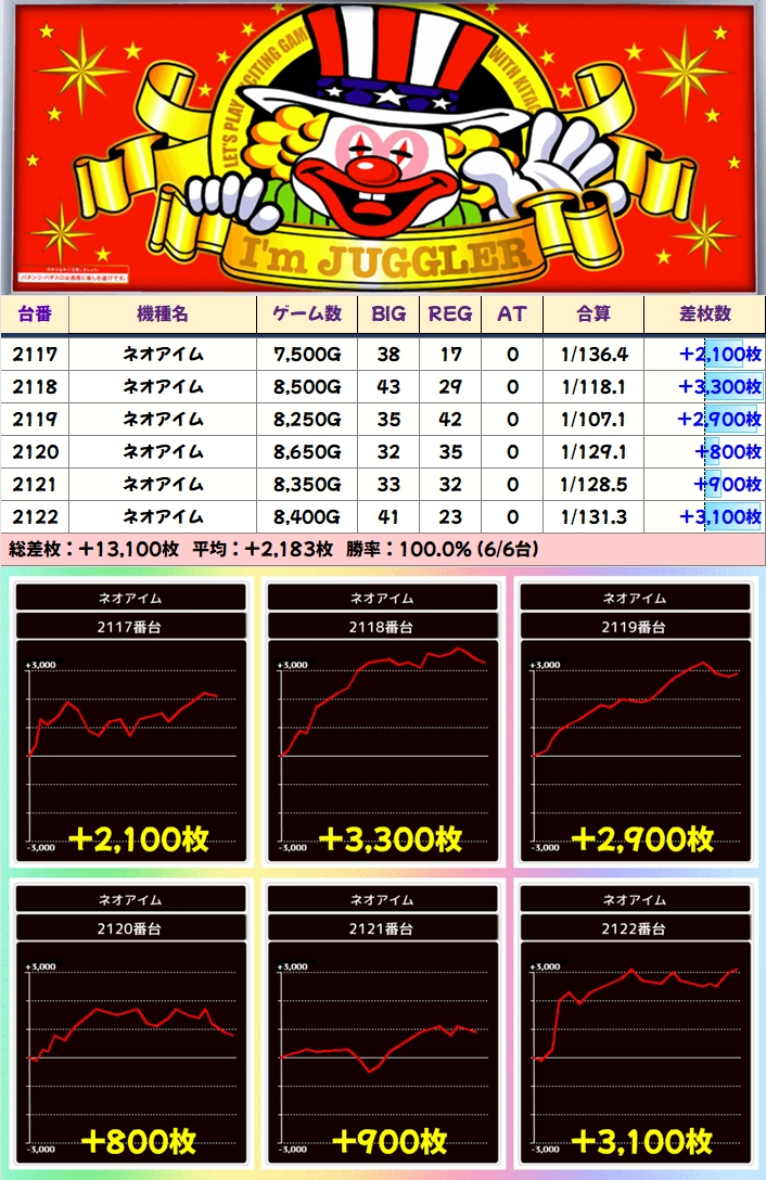 【6台並び】ネオアイム(2117番台〜2122番台)→平均+2,183枚(6/6台+)