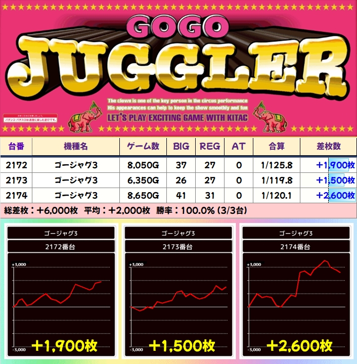 【3台並び】ゴージャグ3(2172番台〜2174番台)→平均+2,000枚(3/3台+)
