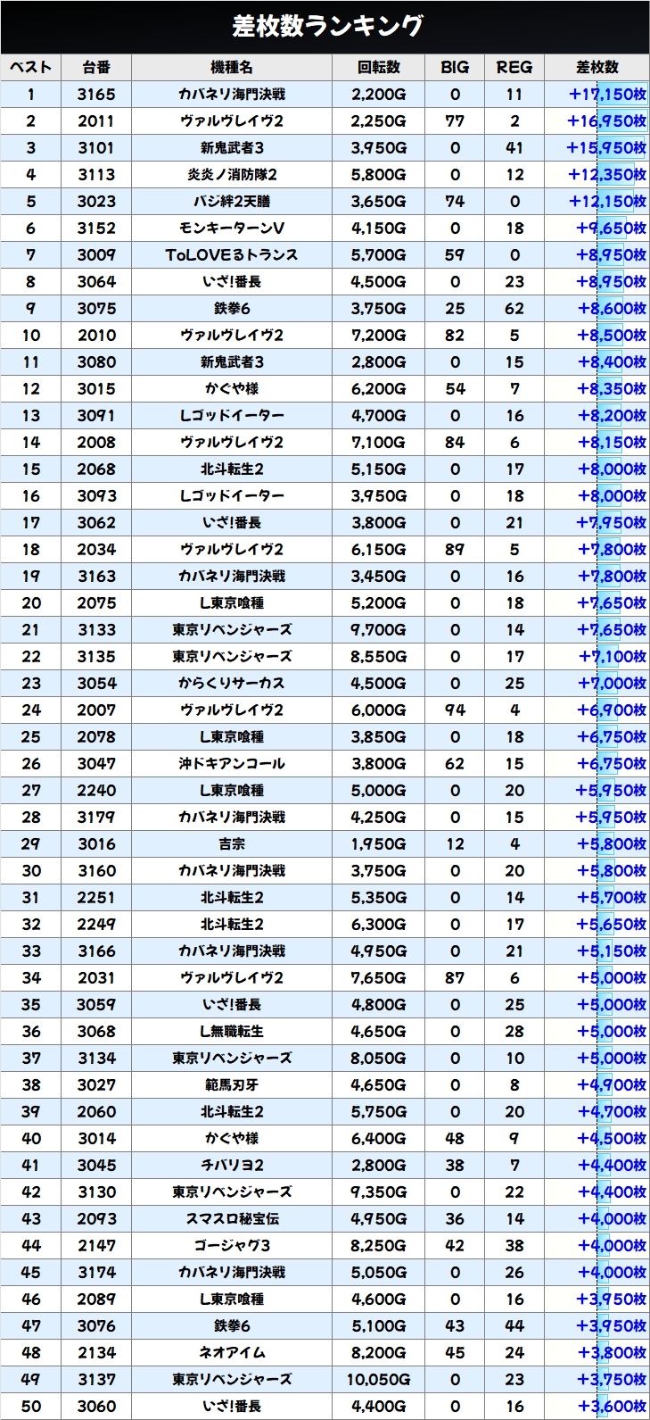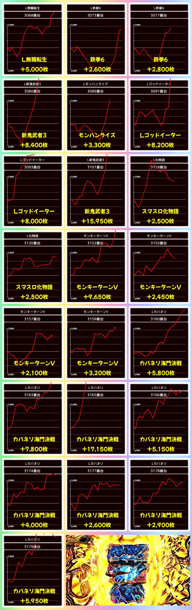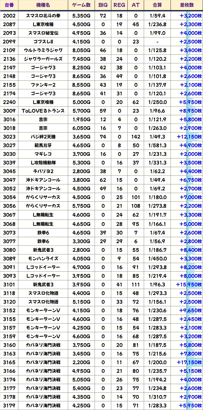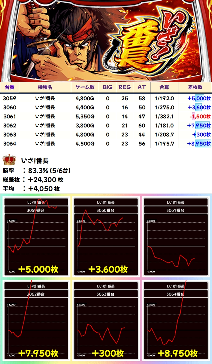 今回は6台機種のいざ!番長が全台系濃厚の結果になっており、平均差枚も+4000枚overと大幅プラスを記録!