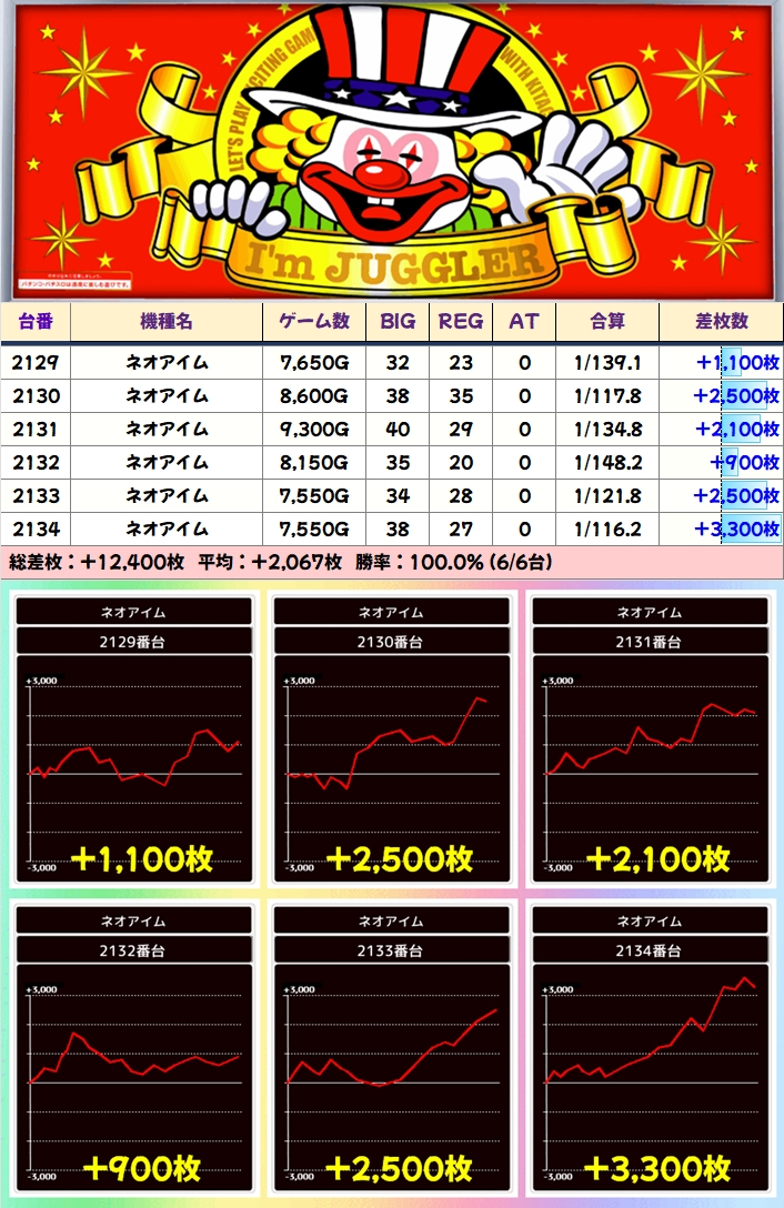【6台並び】ネオアイム(2129番台〜2134番台)→平均+2,067枚(6/6台+)