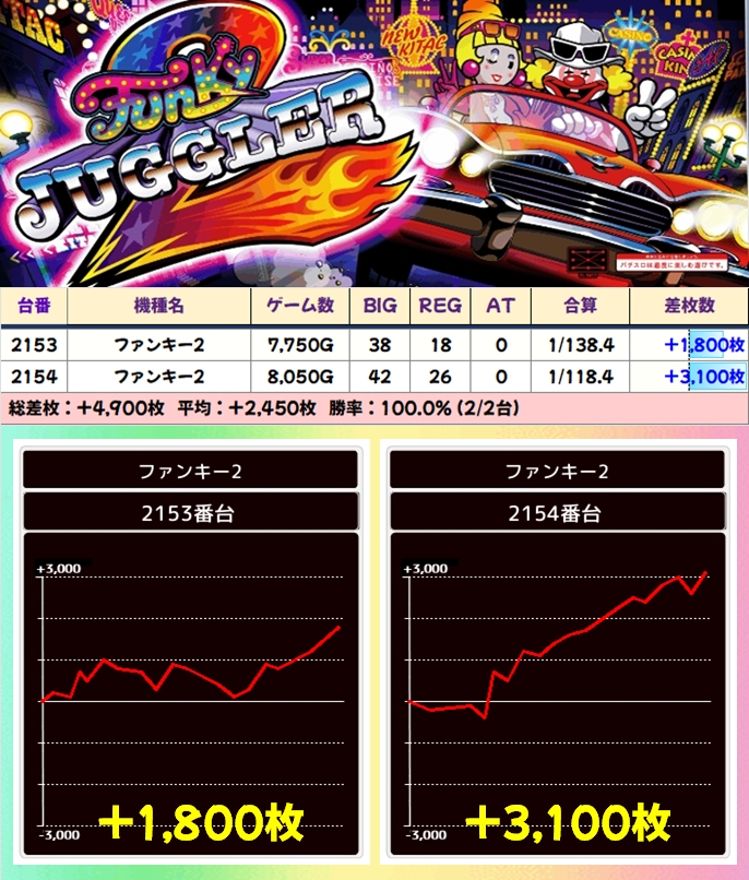 【2台並び】ファンキー2(2153番台〜2154番台)→平均+2,450枚(2/2台+)