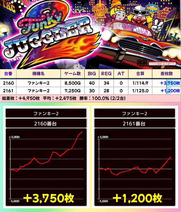 【2台並び】ファンキー2(2160番台〜2161番台)→平均+2,475枚(2/2台+)