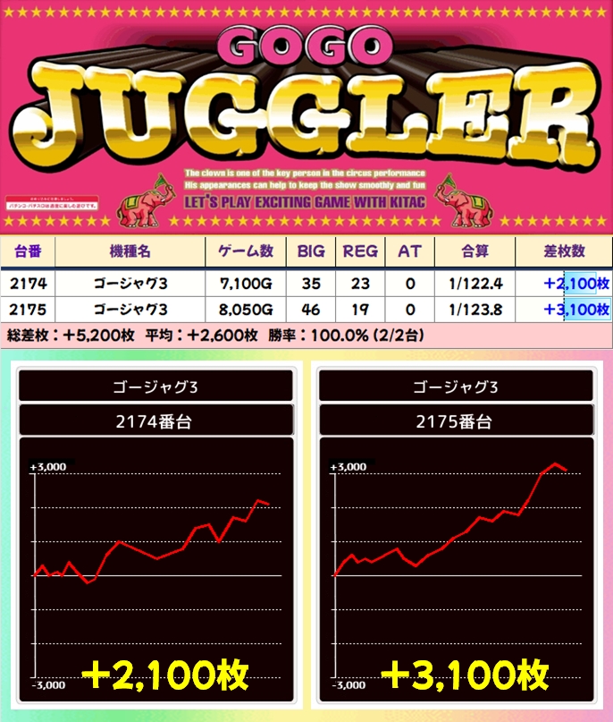 【2台並び】ゴージャグ3(2174番台〜2175番台)→平均+2,600枚(2/2台+)