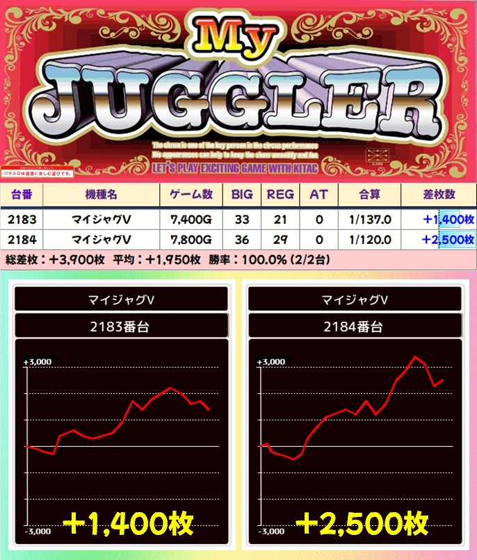 【2台並び】マイジャグV(2183番台〜2184番台)→平均+1,950枚(2/2台+)