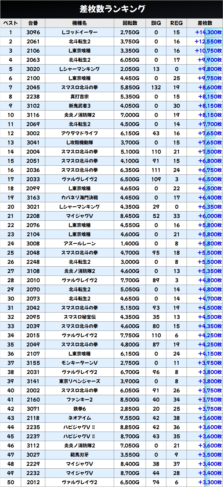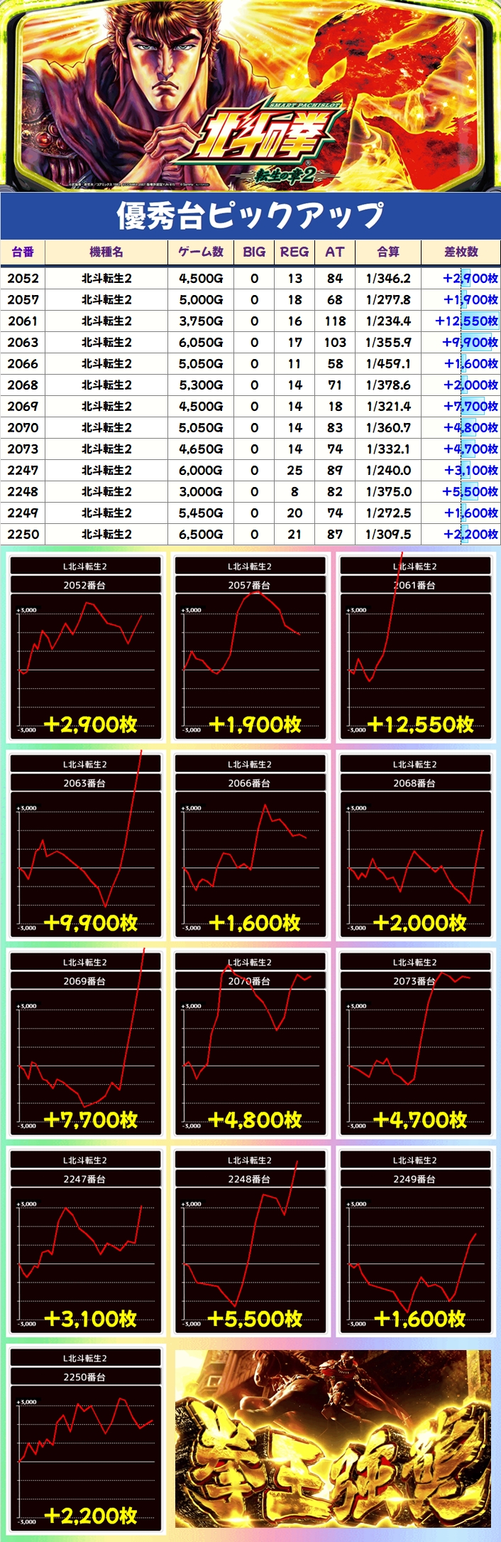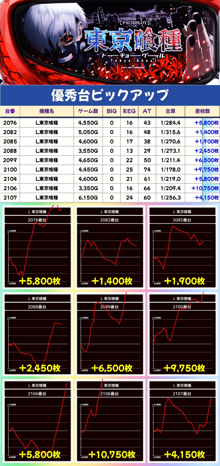 上記の3機種からは優秀台を多数確認でき、北斗転生2と東京喰種からは万枚オーバー台が出現!