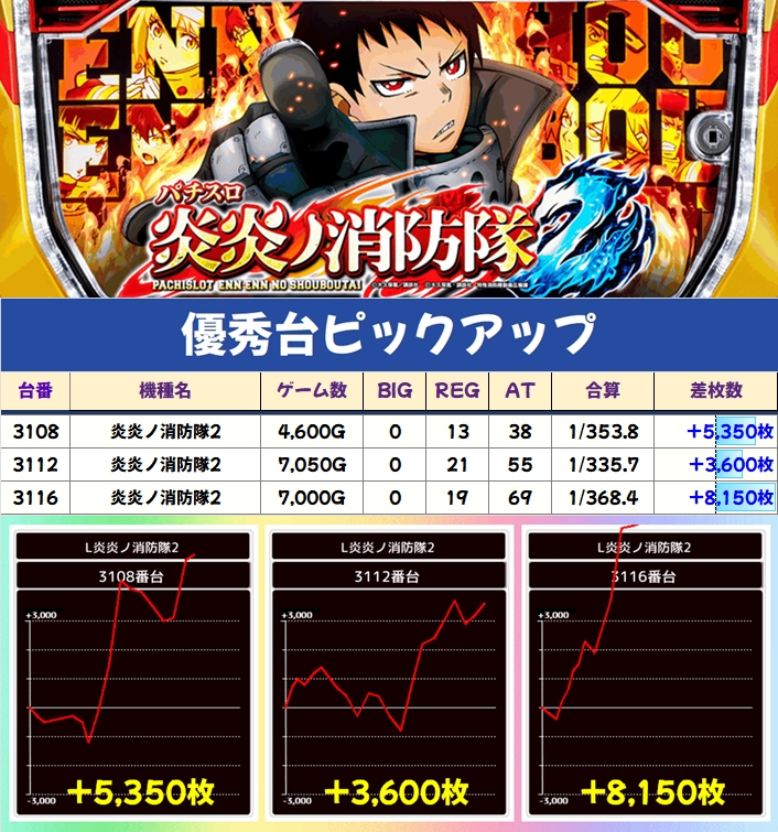 さらに、3F週間オススメ機種の炎炎ノ消防隊2も高配分になっていたようで、+8000枚overを筆頭に優秀台を複数確認することができました!