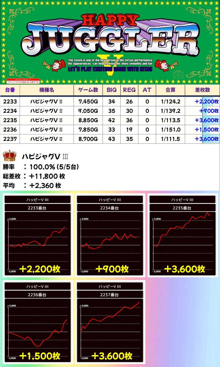 【全台系濃厚】ハピジャグV Ⅲ(5/5台+)→平均+2,360枚
