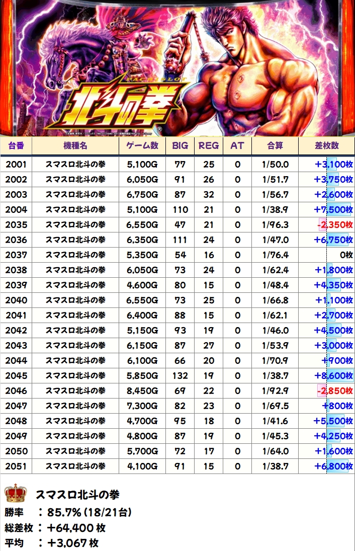 【全台系濃厚】スマスロ北斗の拳(18/21台+)→平均+3,067枚