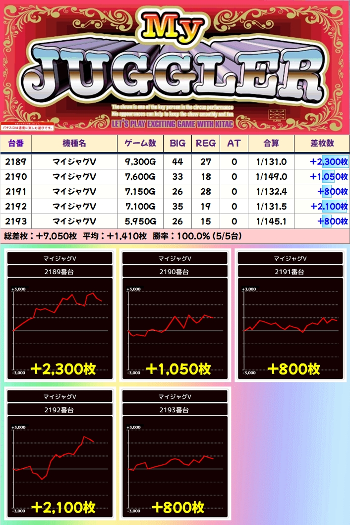 【5台並び】マイジャグV(2189番台〜2193番台)→平均+1,410枚(5/5台+)