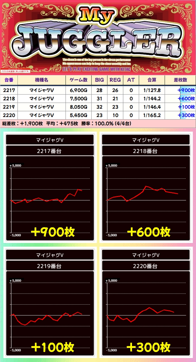 【4台並び】マイジャグV(2217番台〜2220番台)→平均+475枚(4/4台+)