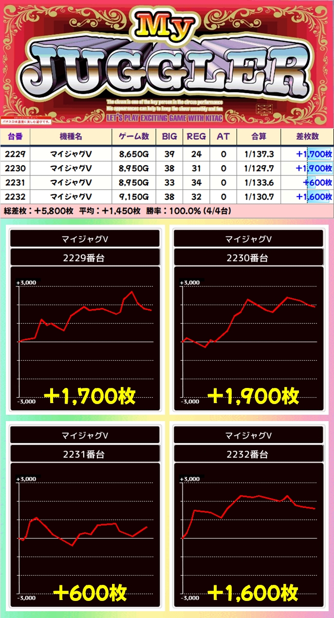 【4台並び】マイジャグV(2229番台〜2232番台)→平均+1,450枚(4/4台+)