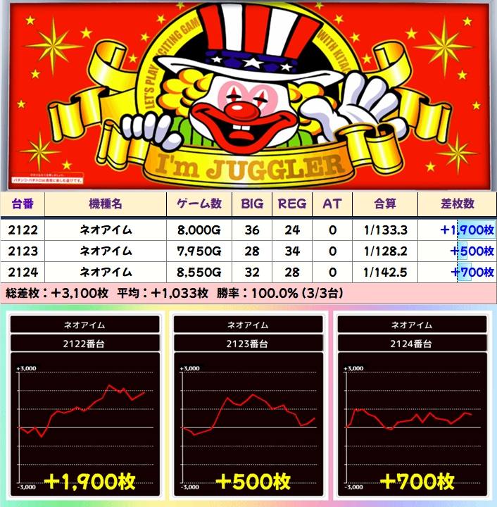 【3台並び】ネオアイム(2122番台〜2124番台)→平均+1,033枚(3/3台+)