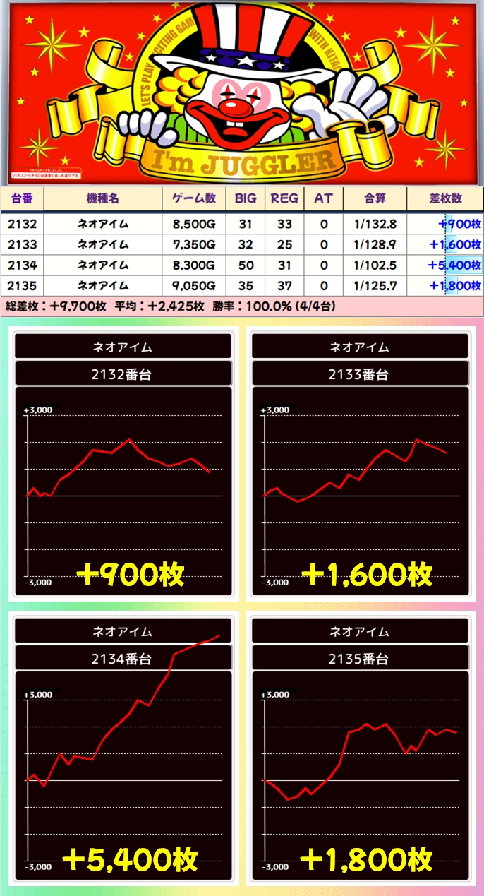 【4台並び】ネオアイム(2132番台〜2135番台)→平均+2,425枚(4/4台+)
